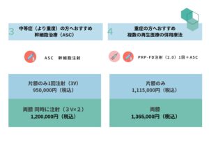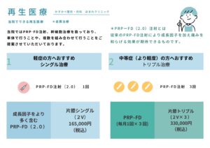 当院では患者様の症状に合わせた様々な治療メニューを用意しております。再生医療は自費診療となり高額な治療にはなります。