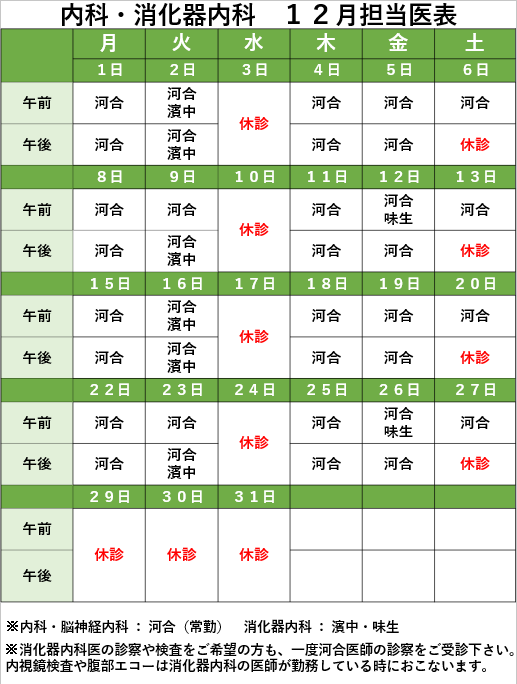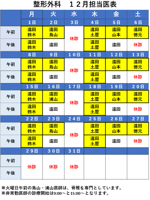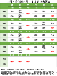 12月の整形外科・内科の担当医表となります。