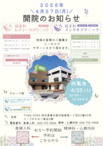 ほまれレディースクリニックとほまれメンタルクリニックの開院日と内覧会の実施が決まりましたので、お知らせいたします。